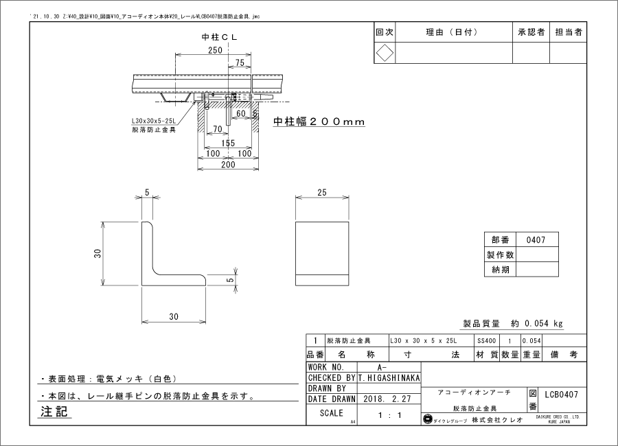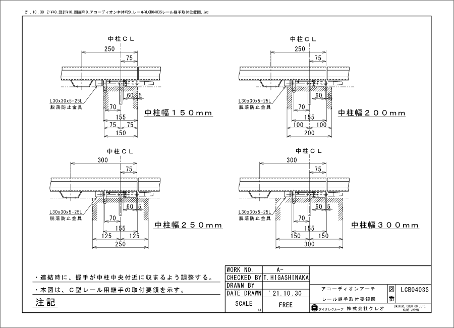 レール切断位置は、中柱の幅に応じて、下記参照のうえ決定すると、レール継手ハンドルの位置が中柱中央となり収まりがよくなります。(「あおり」の形状によっては、必要のないケースもあります。)
